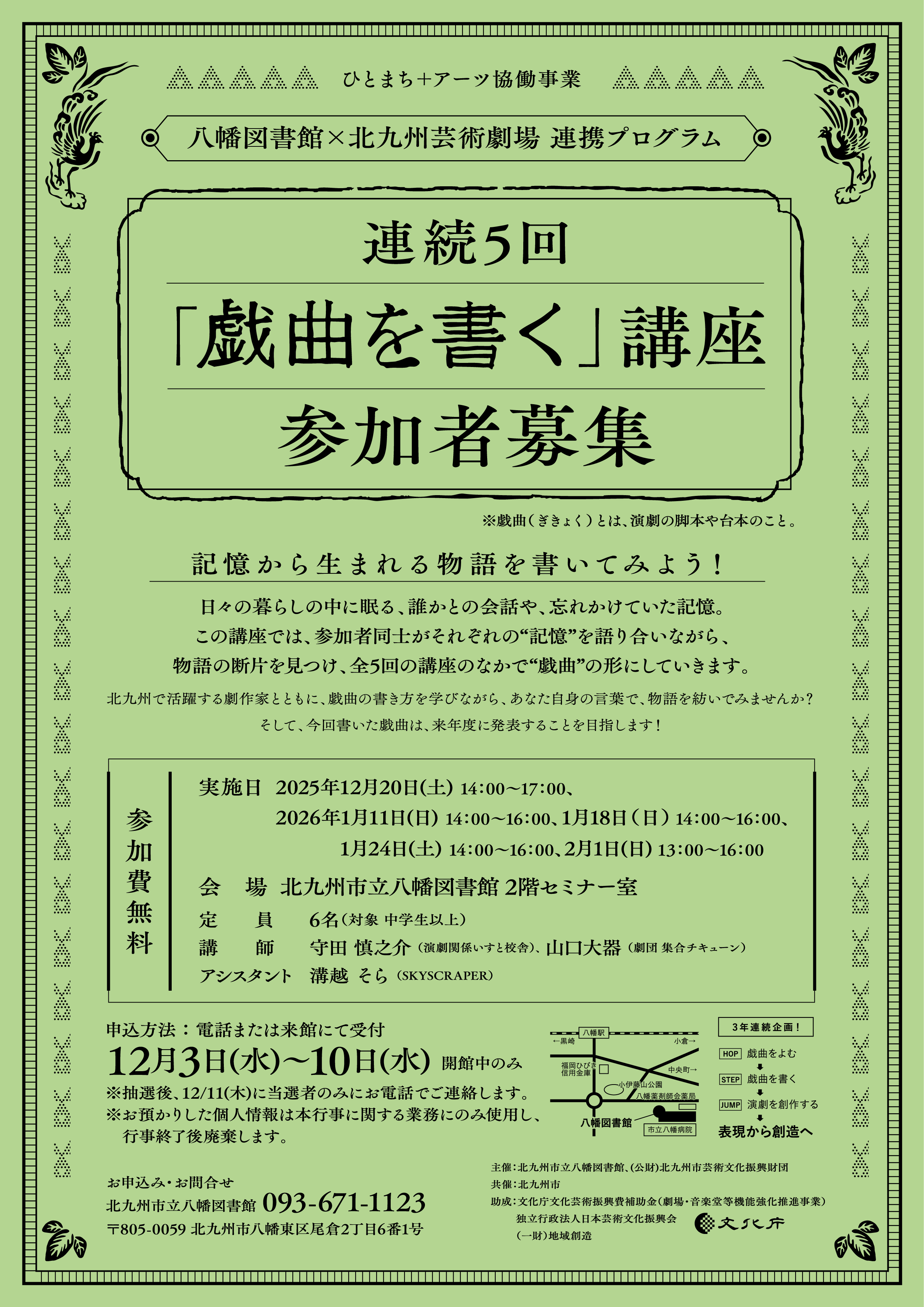 本プログラムは、北九州市立八幡図書館と北九州芸術劇場が連携し、地域の文化拠点施設として互いの専門性を活かしながら、地域を題材にした演劇体験と学びの機会をつくる取り組みです。
